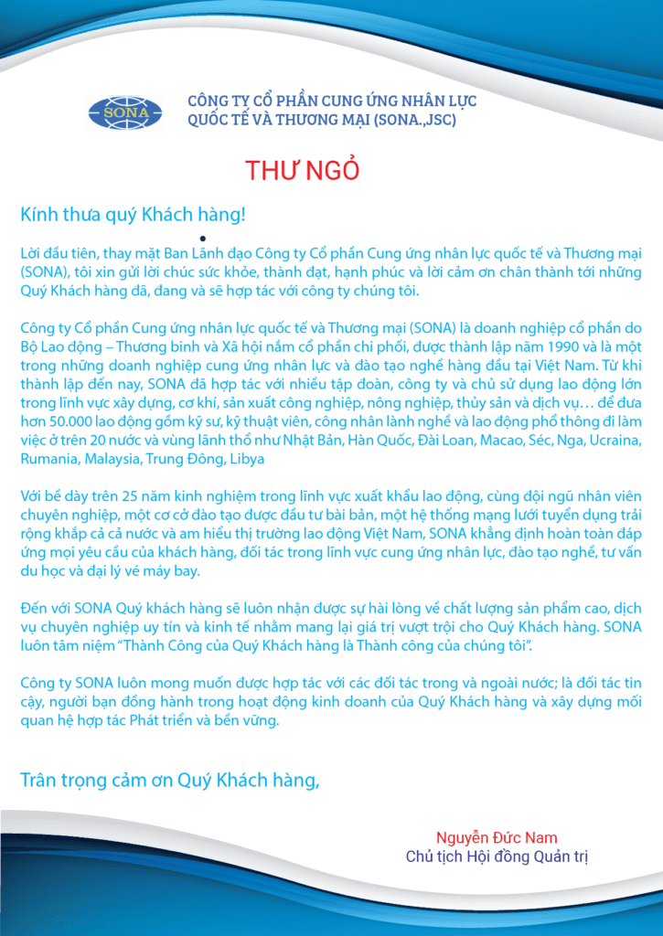 Kính thưa quý Khách hàng! Lời đầu tiên, thay mặt Ban Lãnh đạo Công ty Cổ phần Cung ứng nhân lực quốc tế và Thương mại (SONA), tôi xin gửi lời chúc sức khỏe, thành đạt, hạnh phúc và lời cảm ơn chân thành tới những Quý Khách hàng đã, đang và sẽ hợp tác với […]
